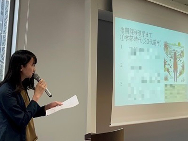 学部卒業後、留学から様々な気づきを経て就職へ、そしてコロナ禍・退職、高専非常勤教師などを経て、博士後期課程進学にたどり着いた気持ちの変化を語っていただきました。短時間で語るのが難しい様々な経験、そして「社会人」を経験したからこそ見える博士後期課程のメリット・デメリットは大変参考になる情報でした。まとめの「『人生終了』しない」という言葉は、矢野さんの今後のキャリア開発への意気込みを表す印象的な言葉でした。