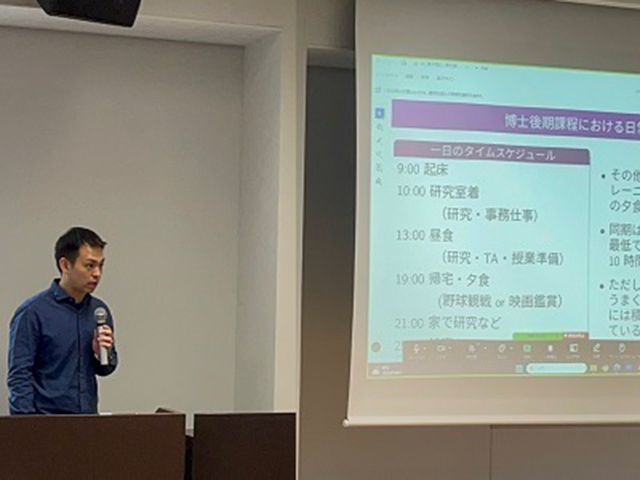 「博士後期課程に進学して想定と違ったこと」の紹介では、理系・実験系の学生の苦労が感じられました。特に理系・実験系の学生にとって、博士後期課程学生をイメージできる有用な情報となったのではないでしょうか。また、1日のタイムスケジュールや3年間の活動スケジュールなどを図解していただき、博士後期課程学生のリアルな日常に触れることができました。最後のメッセージは「早め、早めの行動を」です。このイベントが博士後期課程への進学を考える「早めの」きっかけになることを期待しています。