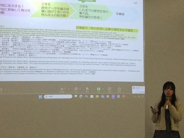 「わたしの一日」や「理工学研究科生の1年」などの紹介は、理系・実験系の学生にとって、博士後期課程学生をイメージできる有用な情報でした。そして、3年間の活動紹介から、論文執筆や国際・国内学会発表など、着実に研究業績を積み上げている様子を伺うことができました。「自分にできるかな」と少し不安に思った方もいるかもしれませんが、畑谷さんからの最後のメッセージは、「迷ったら進んでみる勇気をもってみてもいいかも?」でした。